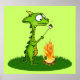Cute little cartoon dragon with big googly eyes and a yellow horn toasting a marshmallow over a camp fire. Original digital cartoon art by Taylor Addams.