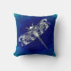 Throw pillow with image of dragon fly on the front against a blue background and blue and purple dragon flies on the back.