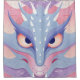 A stylised depiction features a symmetrical, dragon-like face with striking eyes and pointed horns. The use of pastel colours and smooth shapes conveys a friendly and whimsical interpretation of the mythical creature.
