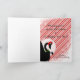 A candy cane background design with the black silhouette of a Christmas dragon wearing a Christmas hat and a holly wreath. A beautiful holiday card for the dragon lover in your life.