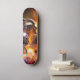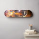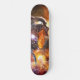 Very unique fantasy designed skateboard. This skateboard has a fire breathing dragon that is flying in a starry night sky.