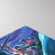 Dragon Rider art is a dramatic fantasy painting by Traci Van Wagoner featuring a blue green dragon in a dramatic flying pose with a wizard rider in red holding a staff high on his back with a child rider behind. Anyone who loves dragons and fantasy art will love this artwork.