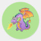 Sticker shown in a small round shape with a cute purple flaming dragon print.
