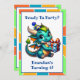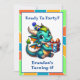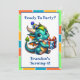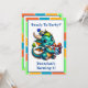 Blue, green, yellow and orange dragon themed boy's birthday party invitations. Cute for any little boy who loves dragons! Cute cartoon dragons in birthday hats holding birthday cakes.