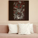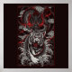 The image depicts a fierce confrontation between a white tiger and a black dragon. The tiger, with its sharp teeth bared and claws extended, is positioned in a defensive stance against the dragon, which is coiled around it. The dragon's eyes glow with an intense red light, and its body is engulfed in flames. The background is dark with swirling clouds and waves, adding to the dramatic and intense atmosphere of the scene. The overall composition is dynamic and visually striking, suggesting a clash of powerful forces.