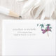 This address label design features a beautiful watercolor dragonfly with wings in shades of purple and pink. It is resting on a simple arrangement of natural watercolor garden greenery in shades of green and blue on a white background.