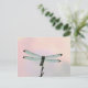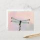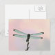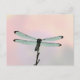 This post card features a nearly silhouetted dragonfly, set against of textured, pastel background of pale blue, pink, and lavender.