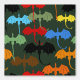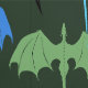 A wing group of dragons in the colours of black, brown, red, orange, yellow, blue, and green fly open wings across a deep dark green backdrop soaring upwards. The dragons are drawn in a tribal tattoo style.
