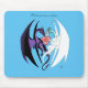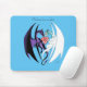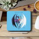 A purple dragon and a white dragon in the air with a Celtic pink and red heart between them in a backdrop of blue