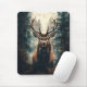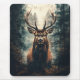 A powerful and dramatic scene of an elk standing proudly in the woods, its majestic antlers towering above the dense forest. The deep shadows and misty atmosphere around the elk create a sense of mystery and strength, capturing the raw beauty of nature.