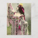 A vintage colourized photograph of a young dark haired woman in a flower covered dress striking a dramatic pose. Flowers cover her hair also. Colours are light pink and deep pink with a touch of yellow.