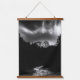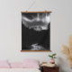 Black and white long exposure landscape photograph. Dramatic sky with snowy mountains and flowing river.