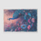 A pale background with filigree frames a peacock surrounded by delicate pink and blue flowers.
