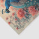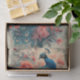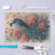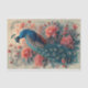 A pale background with filigree frames a peacock surrounded by delicate pink flowers.