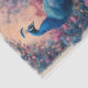 A pale background with filigree frames a peacock surrounded by delicate pink and blue flowers.