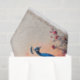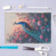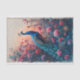 A pale background with filigree frames a peacock surrounded by delicate pink and blue flowers.
