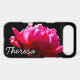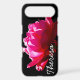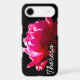 A single gorgeous rose photograph set against a dramatic black background. Exciting romantic design. Scripted monogram name. Colour of rose is bright pink almost magenta in the photo. Horizontal alignment. Script name shown in white font for high contrast. Feminine and fresh.