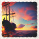 A sailing ship silhouette drifts across calm waters beneath a glowing sunset sky filled with rich orange, red, and purple tones. The smooth horizon line and reflective ocean surface create a serene yet powerful composition that feels adventurous, nostalgic, and visually captivating.