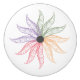 Colourful feathers. Twelve feathers in four colours (3 each in green, orange, red and purple) joined in centre with a black dot.