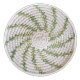 Photo image of a round crocheted pad with variegated greens as the arms of the spiral and white as the background.