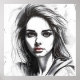 Artistic portrait in black and white of a woman with half long hair. The work is made in an expressive style, combining precise features and more dynamic pencil strokes. The face is drawn with a lot of contrast between the areas of shade and light, creating a dramatic effect. The lips have a slight red color that emerges from the mainly monochrome drawing. The brown-eyed look is intense and direct, and the person is wearing what appears to be a collar garment.