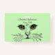 This name or identification badge is light green on the front and back with a black drawing of a pretty cat face with whiskers and bright green eyes. Customise your name and information with the templates.