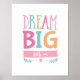 Dream Big little one girls poster print features modern hand written typography. Great for a kids bedroom and suits a pink and aqua decorating scheme.