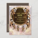 A dream-catcher design with a gold & brown trimmings that includes a round bamboo circle web of life with brown tones feathers and red beads on a soft feather background for a wedding.