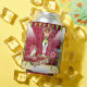 Funky can cooler features tinted ballerina / acrobat antique photo cutout on swing with washi tape "lives in a dream world" caption, cat on pink chair, funky flowered and a pink and green vintage look stage.