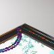 Boho wall art. A rustic wood window with a white, orange and purple feathered dreamcatcher hanging in the window along with a string of colourful crystals. The window overlooks a beautiful scene of forest and mountains.