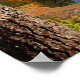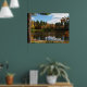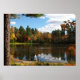 This lovely fine art travel poster features a young woman sitting and dreaming on the dock at the edge of a large pond in New England. Autumn is in the air. The water is surrounded with trees in gorgeous fall foliage colours of yellow, green, red, orange and gold. The blue sky has fluffy white clouds and all this is reflected in the water. The trunk of a large pine tree defines the left side. The brilliant sunshine is reflected in her red hair.