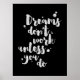 Inspirational poster displaying the phrase "Dreams don't work unless you do" in white brush script with an organic ink texture to achieve an authentic, hand lettered look. Designed to look great on all portrait orientated poster sizes. Please do check if the image needs to be repositioned or resized after changing the poster size.