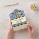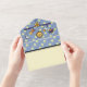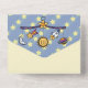 This all-in-one invitation with removable RSVP card is perfect for inspiring dreams and features a background of pale blue stripes in two shades and soft yellow stars. Layered on top of this pattern are panels of pale yellow with a black border to provide a base for sample text on the interior that can be customised for your event and blank space on the exterior that can be used for addressing the cards to the recipient and the returnable section with the appropriate return address. Finally a playful, space-themed mobile adorned with a crescent moon, shooting star, bright sun, rocket ship, and colourful planet hanging from arms with blue and purple zigzag details and a star right in the middle, sits on the flaps with a sample initial inside the sun to add a final custom touch. Be sure to check out the full Dreams of Space Mobile collection for more great gifts and products for a baby shower or the little one in your life.