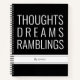 Custom notebook with large oversized type title of "Thoughts Dreams Ramblings" on a black and white journal cover with your name and background colour that can be changed to your favourite.