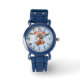 This personalized kids' watch features a chubby, cartoon-style baby pilot flying a tiny, vintage red airplane! The cute little pilot wears a classic brown aviator hat and goggles. A red banner stands over the design with your little one's name.