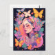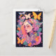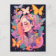 A beautiful postcard featuring a serene portrait of a woman surrounded by colourful butterflies and vibrant flowers, perfect for sending a touch of whimsy and elegance.