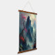 Beautiful majestic, dreamy, and misty mountain landscape with trees and river painting on a wood-topped wall tapestry.