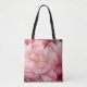 This tote bag is adorned with a dreamlike rendering of a pink peony, its petals appearing impossibly soft and fluffy, as though crafted from clouds. The flower is depicted in exquisite detail, with layers of velvety petals cascading outward, creating a voluminous, cushion-like effect that invites the viewer to rest their gaze—or their head—on its plush surface. A gentle, luminous glow seems to emanate from the peony itself, blending seamlessly into a muted pastel background that enhances its ethereal quality. The overall composition is serene and enchanting, evoking the feeling of sinking into a comforting daydream.
