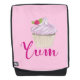 A backpack designed with an illustration of a yummy cupcake with pink swirls and a berry with leaves nestled in the frosting.  "Yum" written in hot pink with a fancy trendy font. Set on a soft pink background.