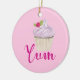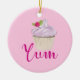 An ornament with a yummy pink cupcake with scrumptious swirls of pink frosting with a yellow cupcake holder. A raspberry with stem and leaves on top. Dreamy and delicious. Text says Yum in a fancy trendy font. Set on a pastel pink backdrop.