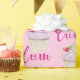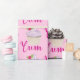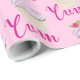 Wrapping paper with a yummy pink cupcake with scrumptious swirls of pink frosting with a yellow cupcake holder. A raspberry with stem and leaves on top. Dreamy and delicious. Text says Yum in a fancy trendy font. Set on a pastel pink backdrop.
