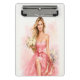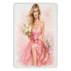 A beautiful woman in a flowing pink dress holds a bouquet of flowers and a pair of high heels in this elegant watercolor illustration.