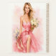 A beautiful woman in a flowing pink dress holds a bouquet of flowers and a pair of high heels in this elegant watercolor illustration.