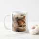 This peaceful image on the mug showcases a tender scene of a child and a fawn asleep together, wrapped in the warmth of soft knits and nature's quiet embrace. The child, wearing a cosy knitted hat and sweater, peacefully rests next to the gentle fawn, both sharing a tranquil moment that symbolises pure innocence and the deep connection between humans and animals. This design brings a sense of calm and serenity, perfect for cosy mornings or relaxing evenings with your favourite drink in hand.