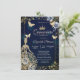 Gold glitter tiara, dress, stars, butterflies, and flowers on a blue background. Invite guests to join you in celebrating this milestone with a design that reflects the magic and joy of your quinceañera.