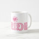 Pretty pink text edged in darker pink and a flower heart is featured on our Dress Up Bride T-shirts, mugs, buttons, magnets, and other items that having a matching groom design!