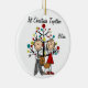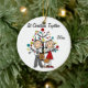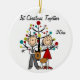 A pretty round ceramic keepsake 1st Christmas Together ornament features a stick figure couple all dressed up, him with a shirt and tie, her in a red dress, with dog, standing in front of the Christmas tree. Easily add your names and the current year to personalise it!