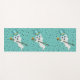 This yoga mat is aqua blue covered with little black stars with three dressed up white ghosts in aqua blue top hats holding fancy black canes trimmed in gold topped with golden skulls.