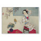 A lady sits in front of a dressing table. A mirror holder and few hair ornaments on the table show the simplicity of her dressing and makeup. Two lotus and big green leaves in the vase, a branch of plum blossom spread the fragrance and also indicate the purity of this lady. The direction of plum branch and the lady�s arms is just contrary to that of her position and table, showing a well balanced composition.