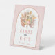 Tropical dried palm leaves, pampas grass and protea flowers soft pink arch botanical cards and gifts wedding Pedestal Sign. This beautiful wedding design features an arch frame on blush pink stained background. In the frame there is your text, a bouquet of dried palm leaves, protea flowers and pampas grass.